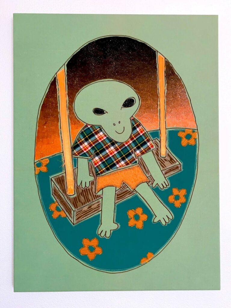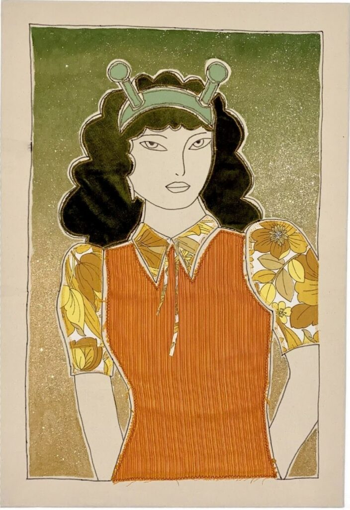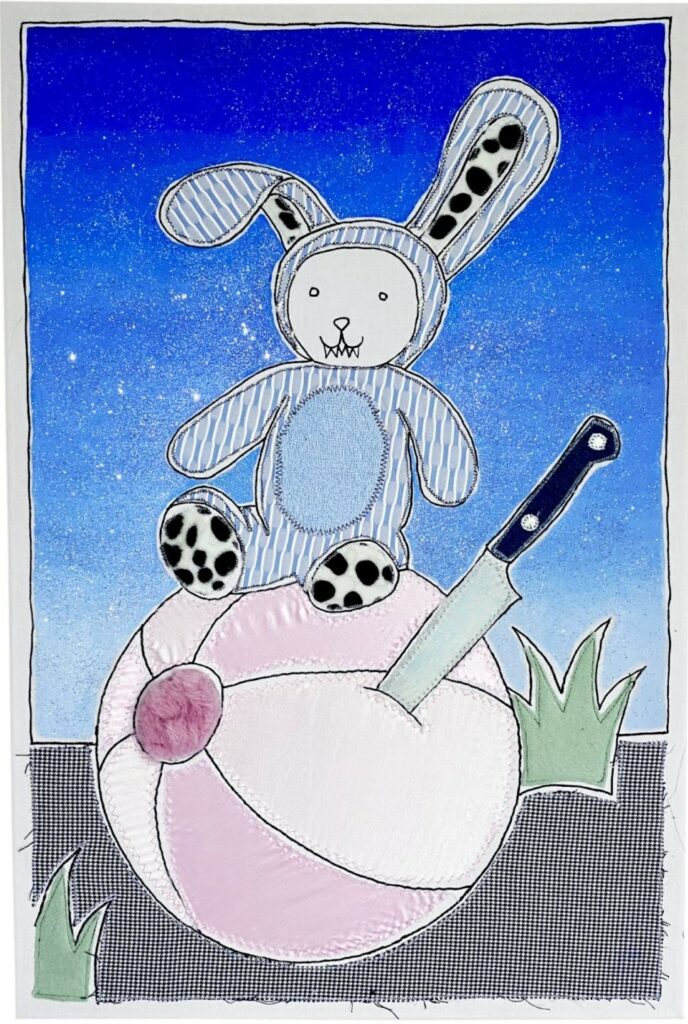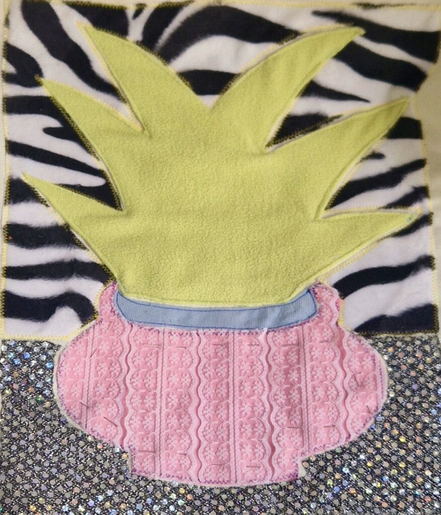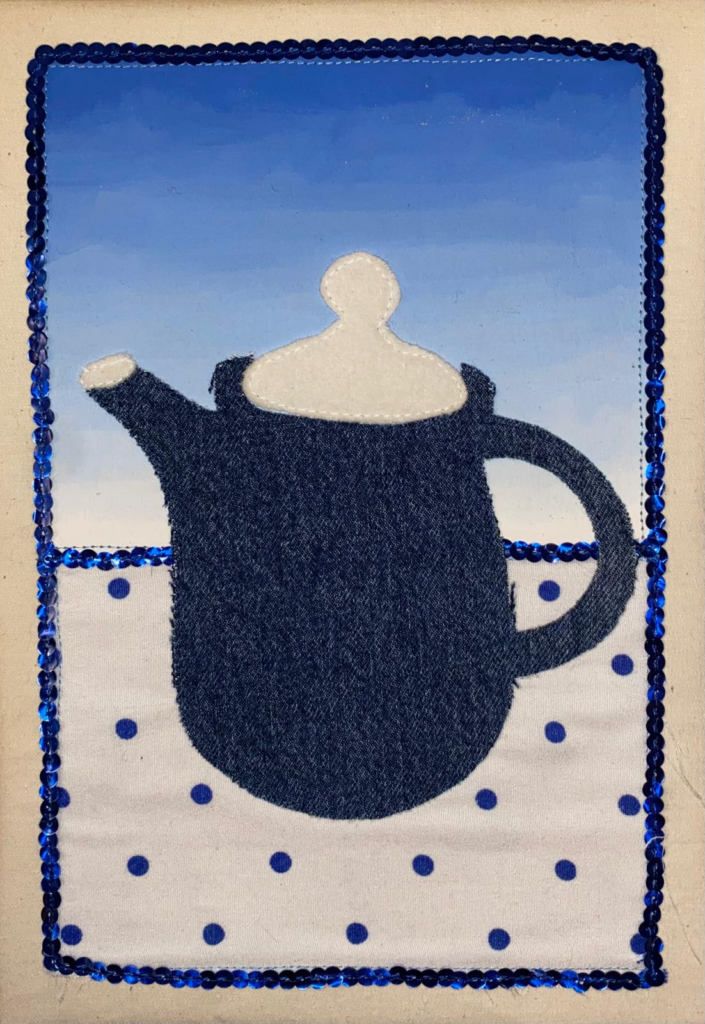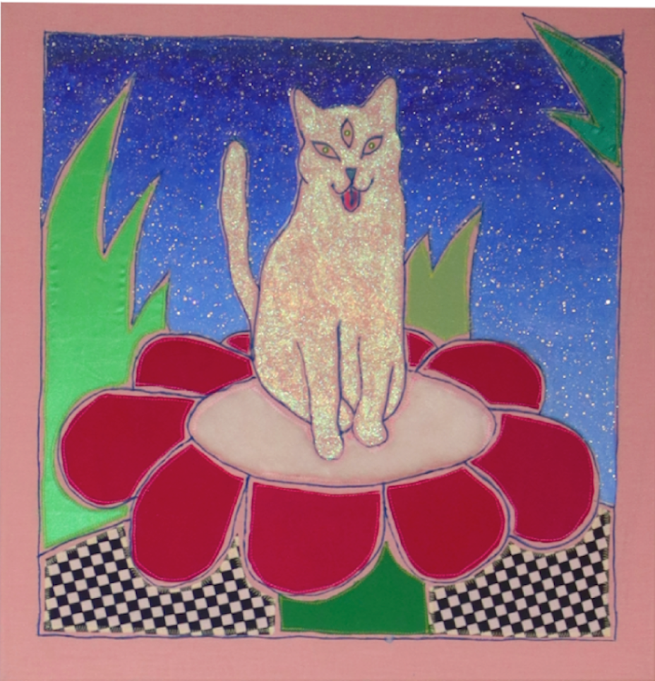 Applique textile sur toile en coton, peinture textile, paillettes.