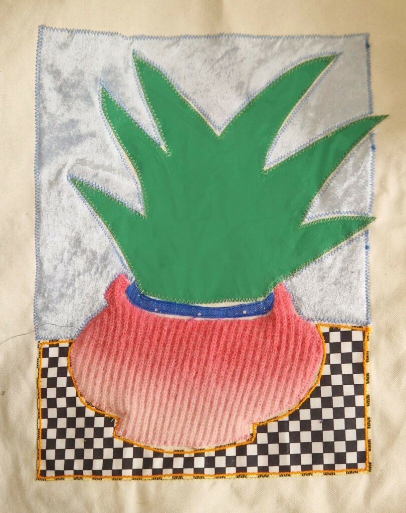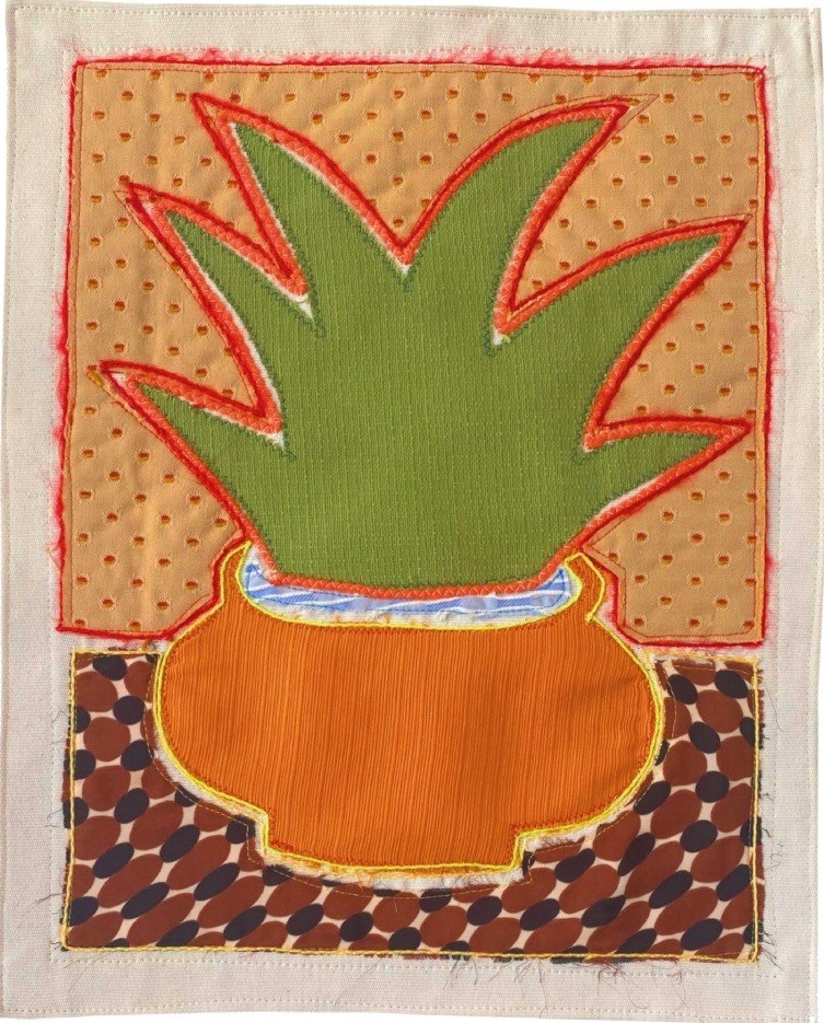 Applique textile sur toile en coton, feutre, mosaïque.