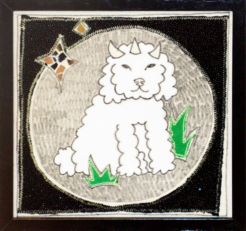 Applique textile, laine, peinture, strass.